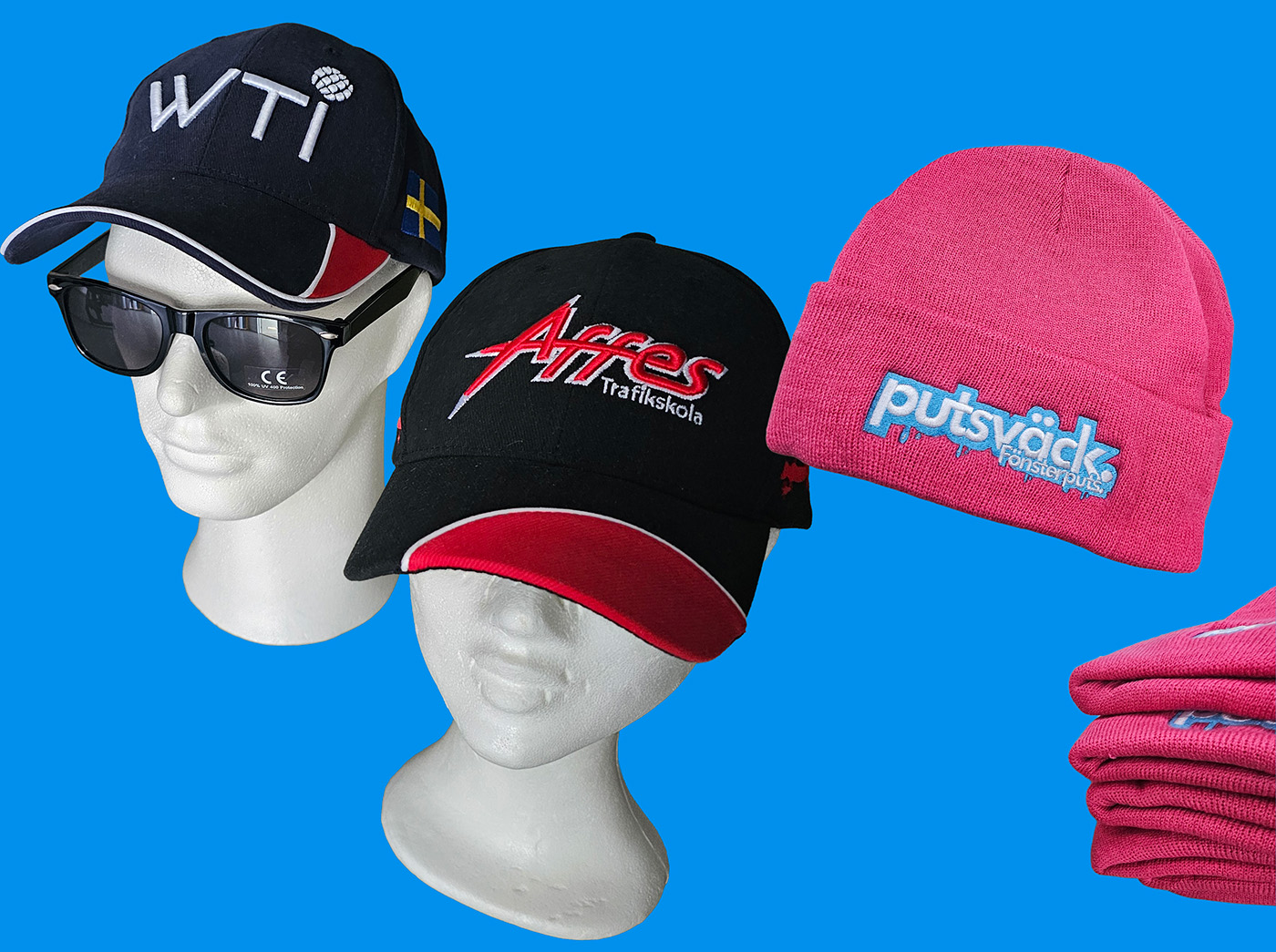 Kepsar, mössor, halsdukar och mycket annat med tryck eller brodyr.